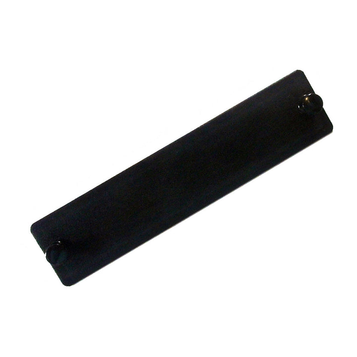 This blank fiber optic adapter panel is black in color and made of powder coated steel. It is designed to fit LGX style 19 inch fiber optic rackmount FDU patch panels.